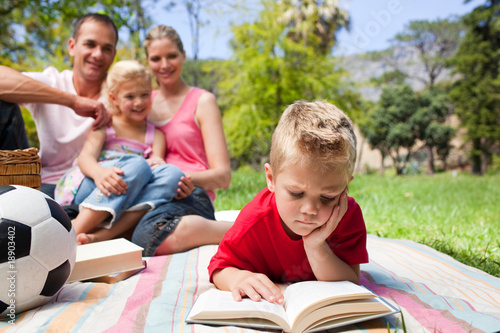 © WavebreakMediaMicro, Fototapeta premium Concentrated blond boy reading while having a picnic with his fa