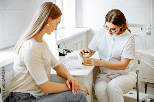 © matilda553, Obraz premium Concentrated dentist sitting at table and shows jaw samples tooth model to the patient