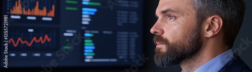 Obraz premium Concentrated man with beard analyzing data on a bright computer screen in...