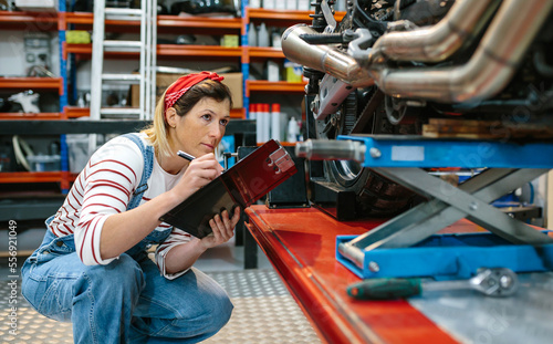© David Pereiras, Obraz premium Concentrated mechanic woman with clipboard reviewing damages in motorbike over platform on workshop