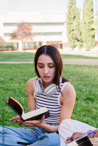 © Dani D.G, Obraz premium Concentrated student reading a book sitting on the grass of the university campus