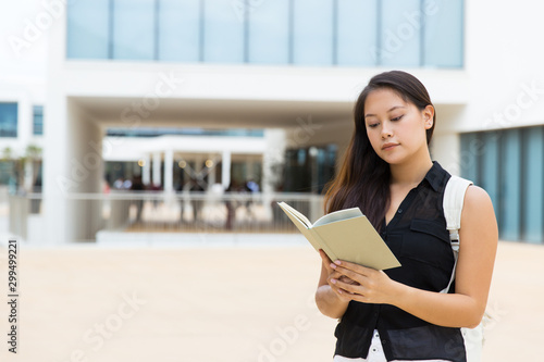 © Mangostar, Fototapeta premium Concentrated young woman reading book. Young female college student with backpack standing on street and reading book. Education concept