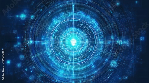Fototapeta premium Concentric circles and data visualizations form a luminous blue pattern