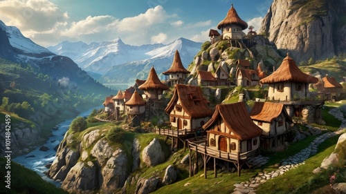 Obraz premium Concept art illustration of fantasy village in the mountains