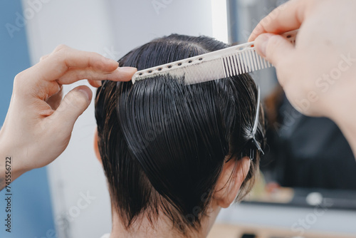 © Parilov, Naklejka premium Concept Barbershop for man. Closeup master hairdresser does hairstyle and style with scissors and comb