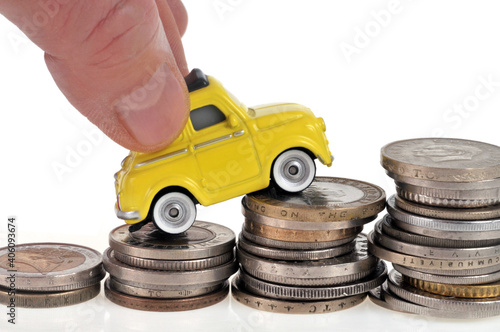© Richard Villalon, Fototapeta premium Concept de frais de déplacement avec une voiture roulant sur des piles de pièces