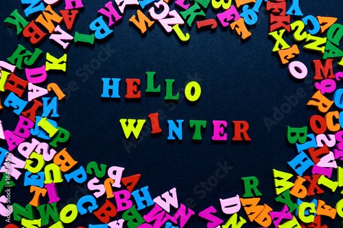 Fototapeta premium concept design - the word HELLO WINTER from multi-colored wooden letters on a black background, creative idea