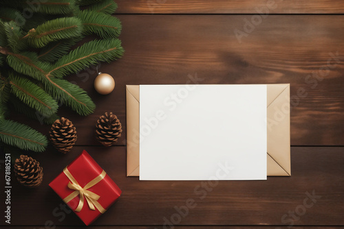 © Adin, Fototapeta premium Concept mockup for mail letter to Santa Claus on wooden table. White paper for wishlist, top view