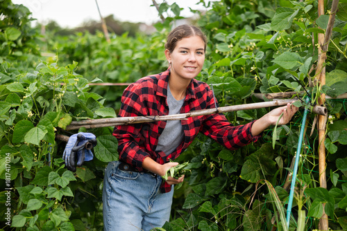 © JackF, Fototapeta premium Concept of active hobby, cultivation and gardening in rural area. Young woman is working in garden between beds, picking ripe beans from branches, and holding lot of fruits in hands.