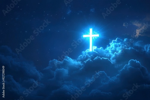 © Dzikrul Husnani, Naklejka premium Concept of christian religion shining cross on the background of cloudy night sky. Dark sky with cross and cloud. Divine shining heaven, light. Religious background , ai