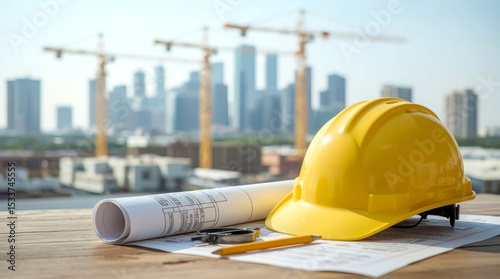 © Ada, Fototapeta premium Concept of construction and design, blueprints, bright yellow hard hat, rolled-up blueprints, a compass, and a yellow pencil are neatly laid out on a wooden desk or table in the foreground.