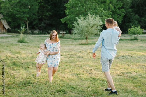 © Serhii, Naklejka premium Concept of family spending time together. Mother, father hold hands children daughter. Running in green grass in nature on summer day. Mom, dad, and kids walking in park at sunset. Spring vacation.