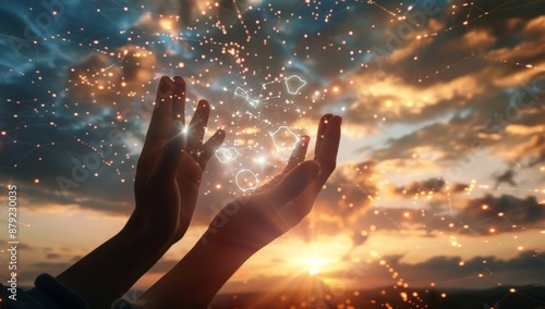 © neiros, Naklejka premium Concept of palm hands holding global network connections, innovative technology in science and communication.