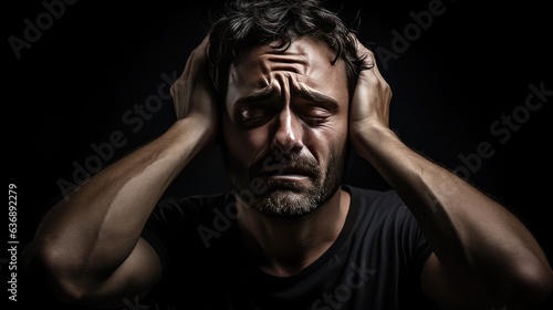 © Татьяна Креминская, Fototapeta premium Concept of Physical and Psychological Exhaustion. The man's hands hold his head, shoulders slumped, and his facial expression shows tiredness and helplessness.