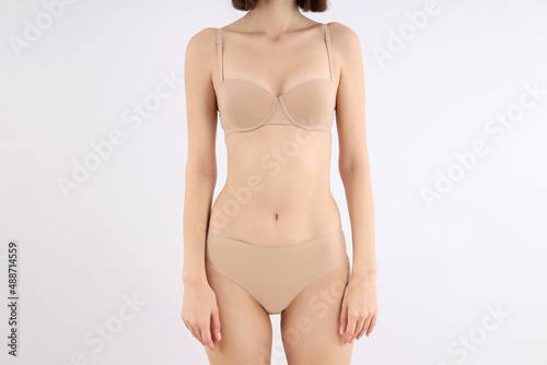 © Atlas, Fototapeta premium Concept of weight loss with young slim woman on light background
