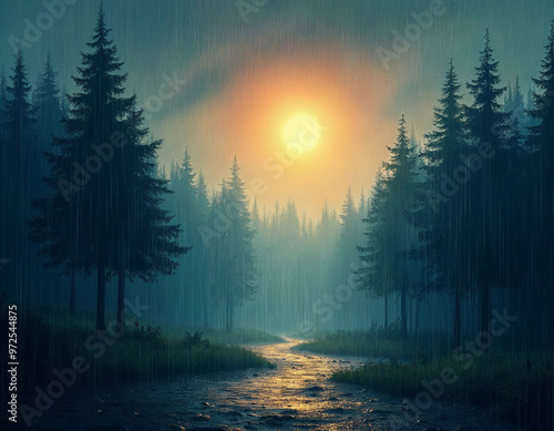 Fototapeta premium Concept photo of rainy day with sun, landscape background