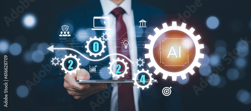 Obraz premium 2024 concept, Programmer people working on laptops with AI, artificial...