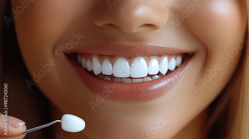 © annebel146, Obraz premium Concept teeth whitening or facings. Beautiful young woman teeth. Teeth whitening. Dental health concept. Teeth whitening procedure. Dental care. Dentistry concept. Perfect healthy teeth. Closeup