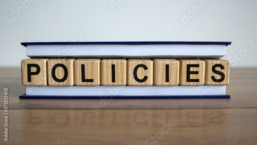 © Dzmitry, Obraz premium Concept word 'policies' on wooden cubes between pages of a book on a beautiful wooden table. White background. Business concept.