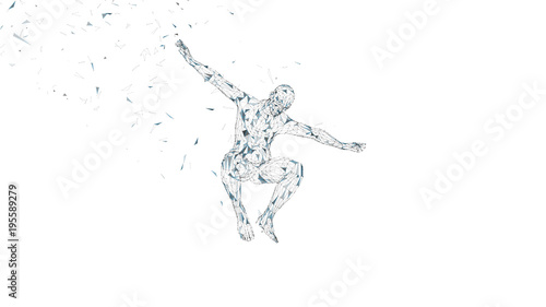 Fototapeta premium Conceptual abstract man in a jump. Connected lines, dots, triangles, particles isolated on white. Artificial intelligence concept. High technology vector, digital background. 3D render vector
