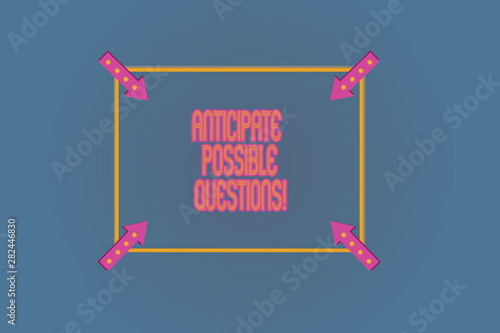 © Zofia, Fototapeta premium Conceptual hand writing showing Anticipate Possible Questions. Business photo text Expect or look forward for an interrogation Square Outline with Corner Arrows Pointing on Color Background
