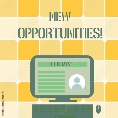© A, Fototapeta premium Conceptual hand writing showing New Opportunities. Concept meaning exchange views condition favorable for attainment goal Computer Mounted on Stand with Online Profile Data on Screen