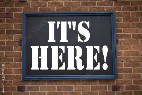 © Zofia, Obraz premium Conceptual hand writing text caption inspiration showing announcement It's Here. Business concept for advertisement written on frame old brick background with copy space