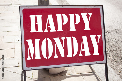 © Zofia, Obraz premium Conceptual hand writing text caption inspiration showing Happy Monday . Business concept for Greeting Announcement written on old announcement road sign with background and copy space