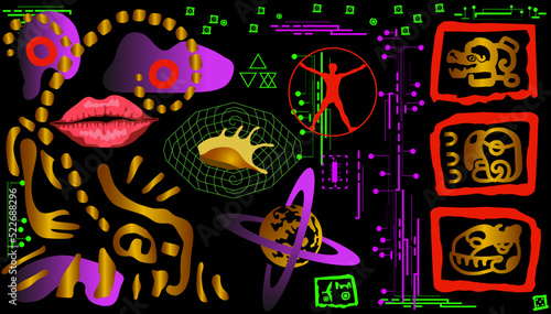© Oleksii, Obraz premium Conceptual illustration about man, space and ancient Maya and Toltec symbols
