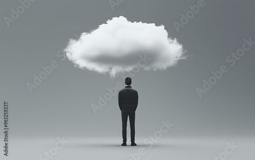 Fototapeta premium Conceptual Image of a Man Standing Under a Cloud Symbolizing Thought, Imagination, or Dreamlike States