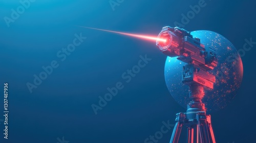 © Сергей Захаров, Naklejka premium conceptual image of robotic total station emitting laser beams onto abstract digital earth with copy space