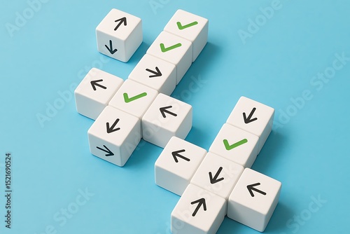 © SD AI, Obraz premium Conceptual Pathfinding: Dice with Arrows and Checkmarks Illustrating Directions, Navigation, and Validation on a Light Blue Background, Representing Progress and Problem-Solving