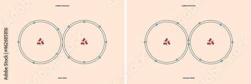 Naklejka premium Conceptual vector representation of a carbon molecule, made up of two atoms, and the types of chemical bonds: covalent, atoms sharing electrons, and ionic, an atom gives an electron to another atom.