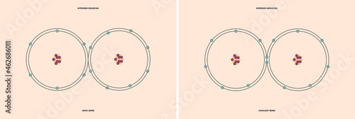 © Patrícia F. Carvalho, Naklejka premium Conceptual vector representation of a nitrogen molecule, made up of two atoms, and the types of chemical bonds: covalent, atoms sharing electrons, and ionic, an atom gives an electron to another atom.