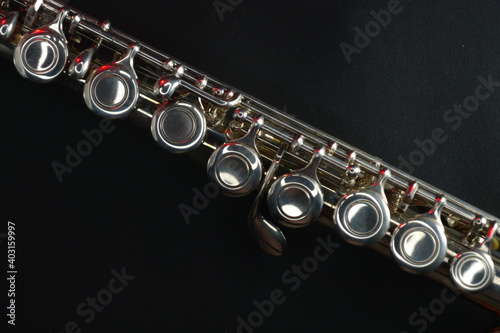 © Bernhard, Fototapeta premium Concert flute (part) on dark background with red accent lights