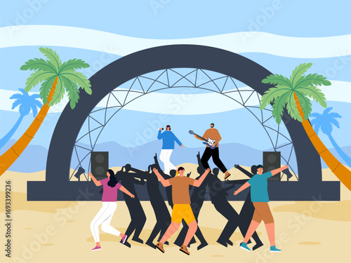 Obraz premium Concert on the beach for summer celebration. Concert illustration. Flat...