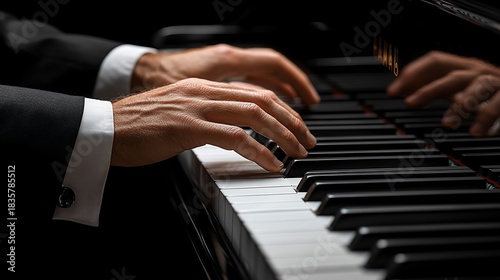 © Gadis, Fototapeta premium Concert pianist's hands playing grand piano, close-up, dark stage