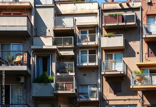 Fototapeta premium Concrete balconies, varied sizes, sunlit, shadows, pattern, shadow