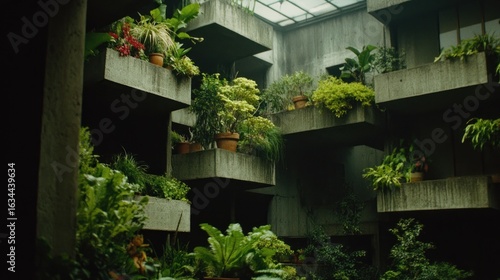 © Izza, Fototapeta premium Concrete balconies with potted plants create a geometric architectural design in the urban