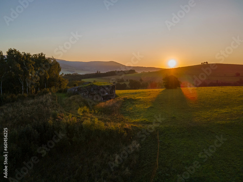 © Luk, Fototapeta premium Concrete bunker in czech mountains during sunrise. Orlicke hory.