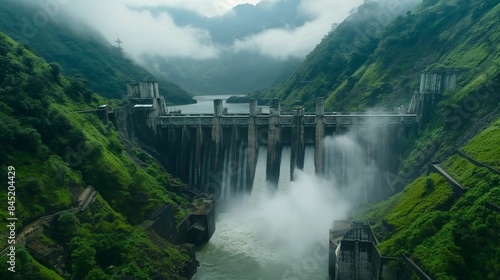 © DenisNata, Fototapeta premium Concrete dam releasing water in a misty valley surrounded by lush green mountains.
