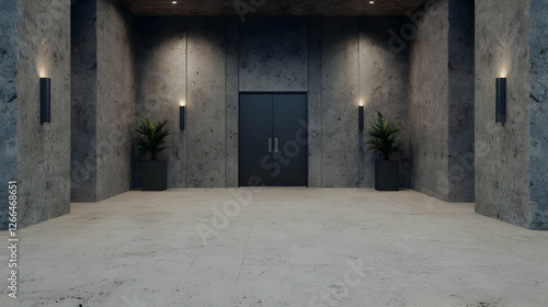 Obraz premium Concrete hallway entrance, dark ambiance, plants, modern design, interior...