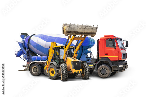 © Anoo, Fototapeta premium Concrete mixer truck and bulldozer loader close-up on a white isolated background.Construction equipment. element for design. Rental of construction equipment. delivery of concrete.
