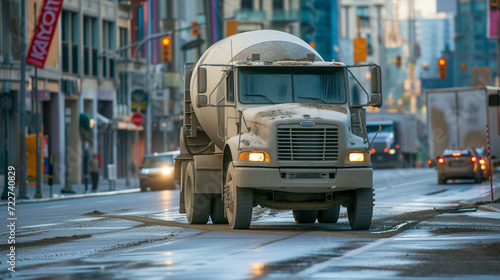 Obraz premium Concrete truck on the move, urban setting, showcasing the vehicle's size and...