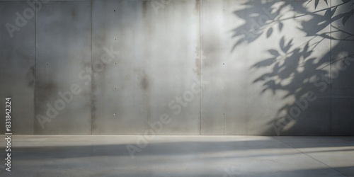 Fototapeta premium Concrete Wall Leaf Shadows: A neutral grey concrete wall and floor with delicate leaf shadows, ideal for an industrial-style product display.