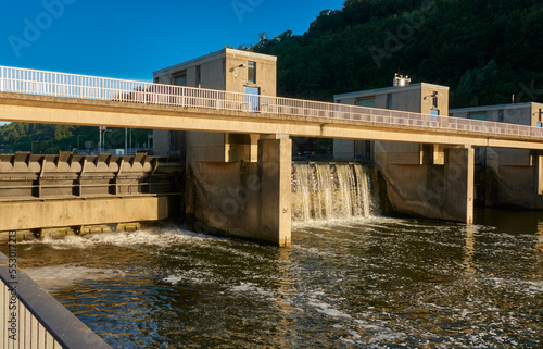 Naklejka premium Concrete water building in a river. Dam to close a water body. Warm evening light in summer. Germany, Esslingen near Stuttgart.