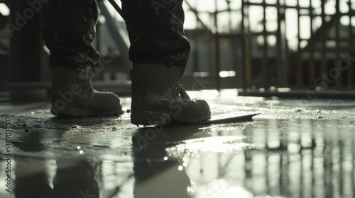 Obraz premium Concrete worker smoothing freshly poured cement on a foundation. Featuring...