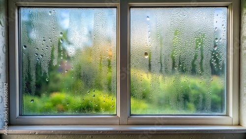 © Nasnunt, Naklejka premium Condensation on window inside house , wet, moisture, droplets, glass, interior, home, winter, humid, weather, condense, damp