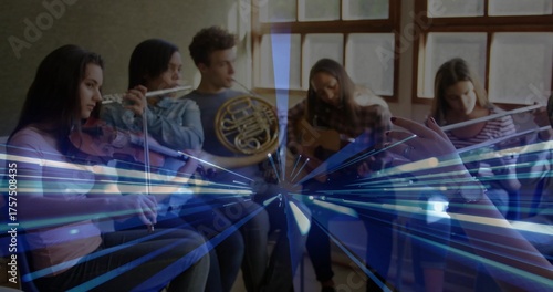 Fototapeta premium Conductor's baton directing six musicians playing violin, flutes, horn and guitar in studio