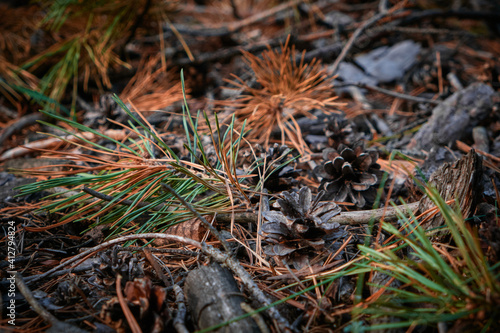 © Trevor, Fototapeta premium cones and corners on the ground in a pine forest